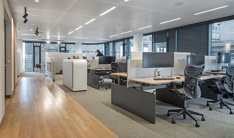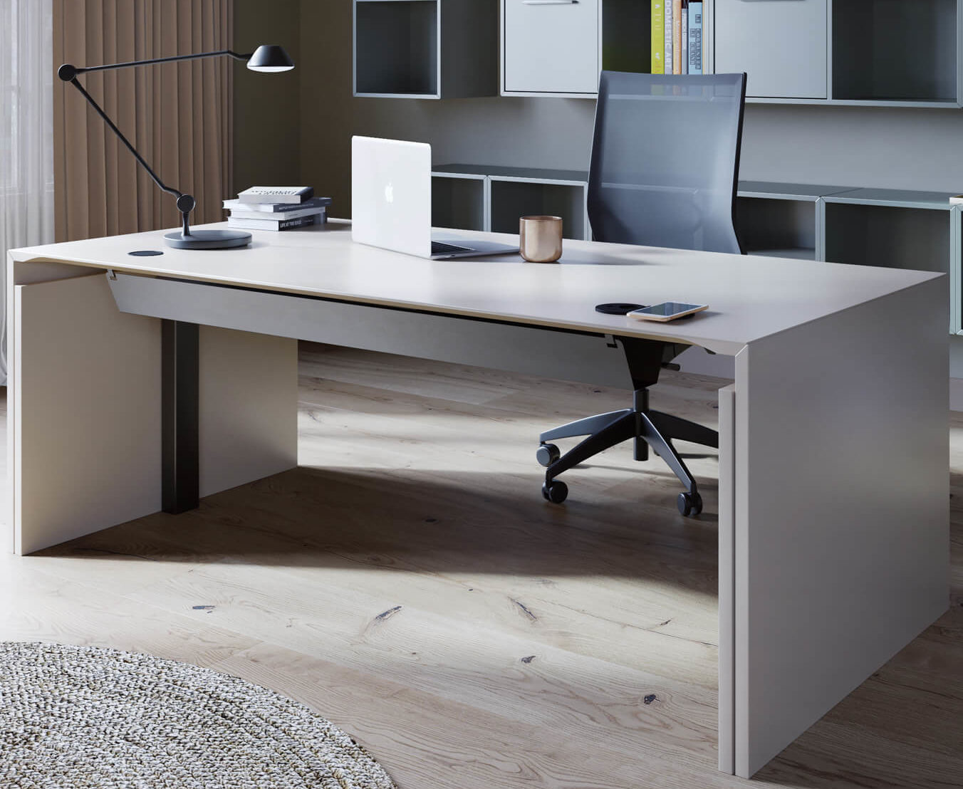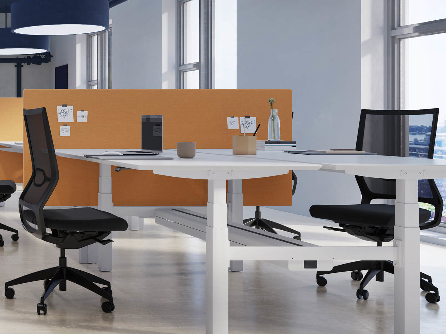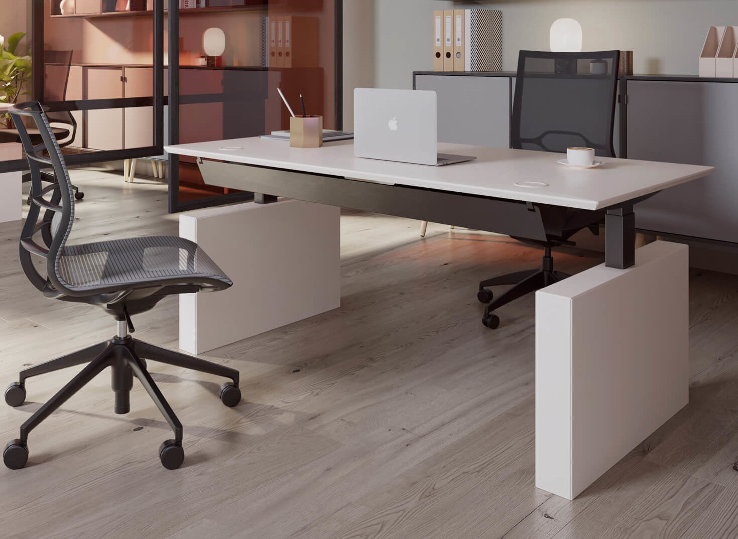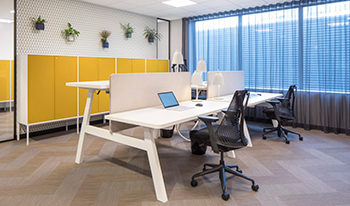 Op kantoor of in huis achter flexibele bureaus